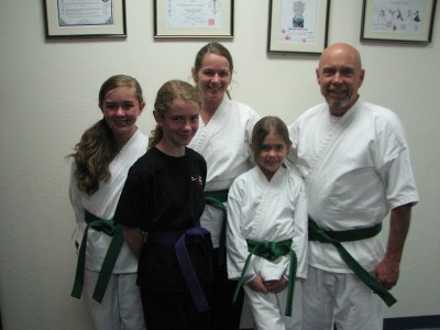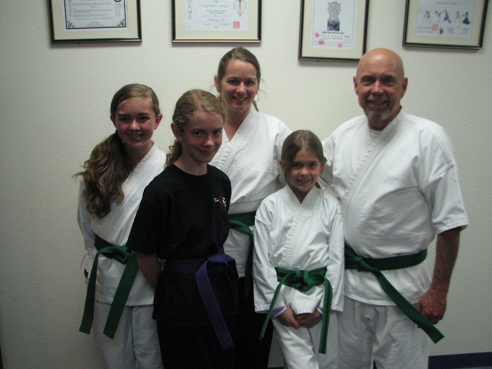| Petal Rose’s belt looks blue, but she is a PURPLE belt now 🙂 The rest of us are green/high green belts. |